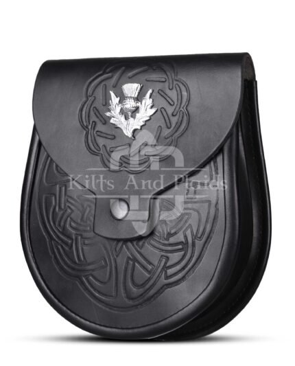 Black leather flap features a detailed thistle emblem – a symbol of Scotland