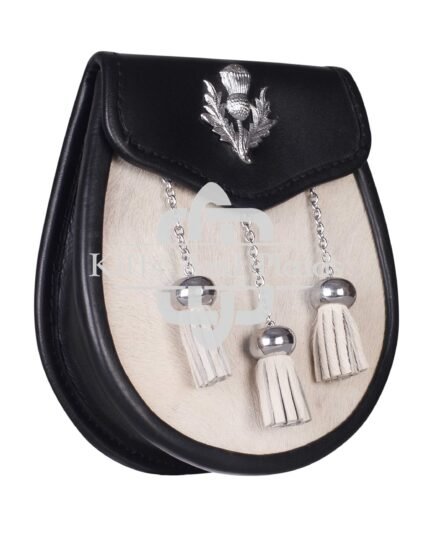 Thistle Emblem Black Leather White Bovine Fur Sporran