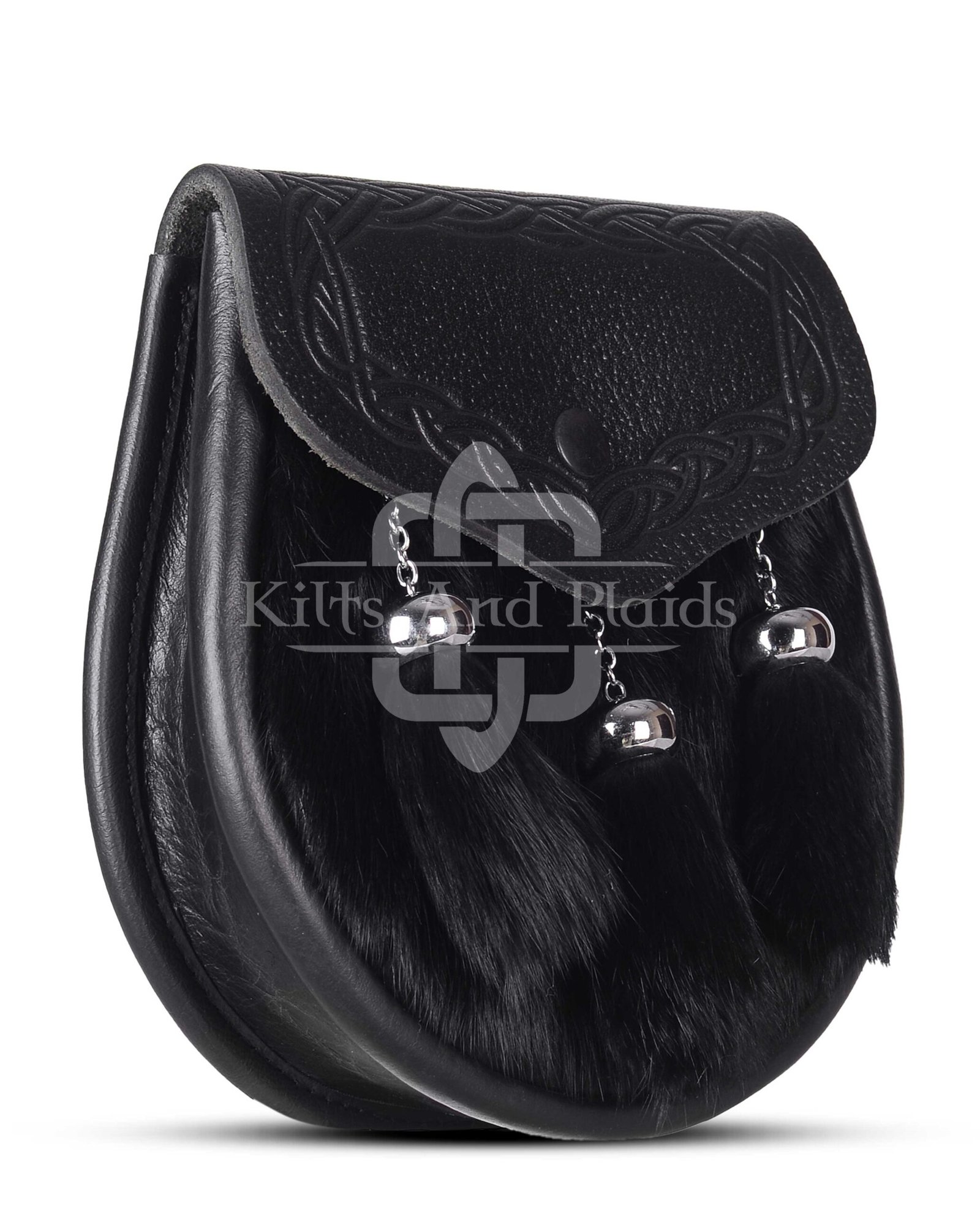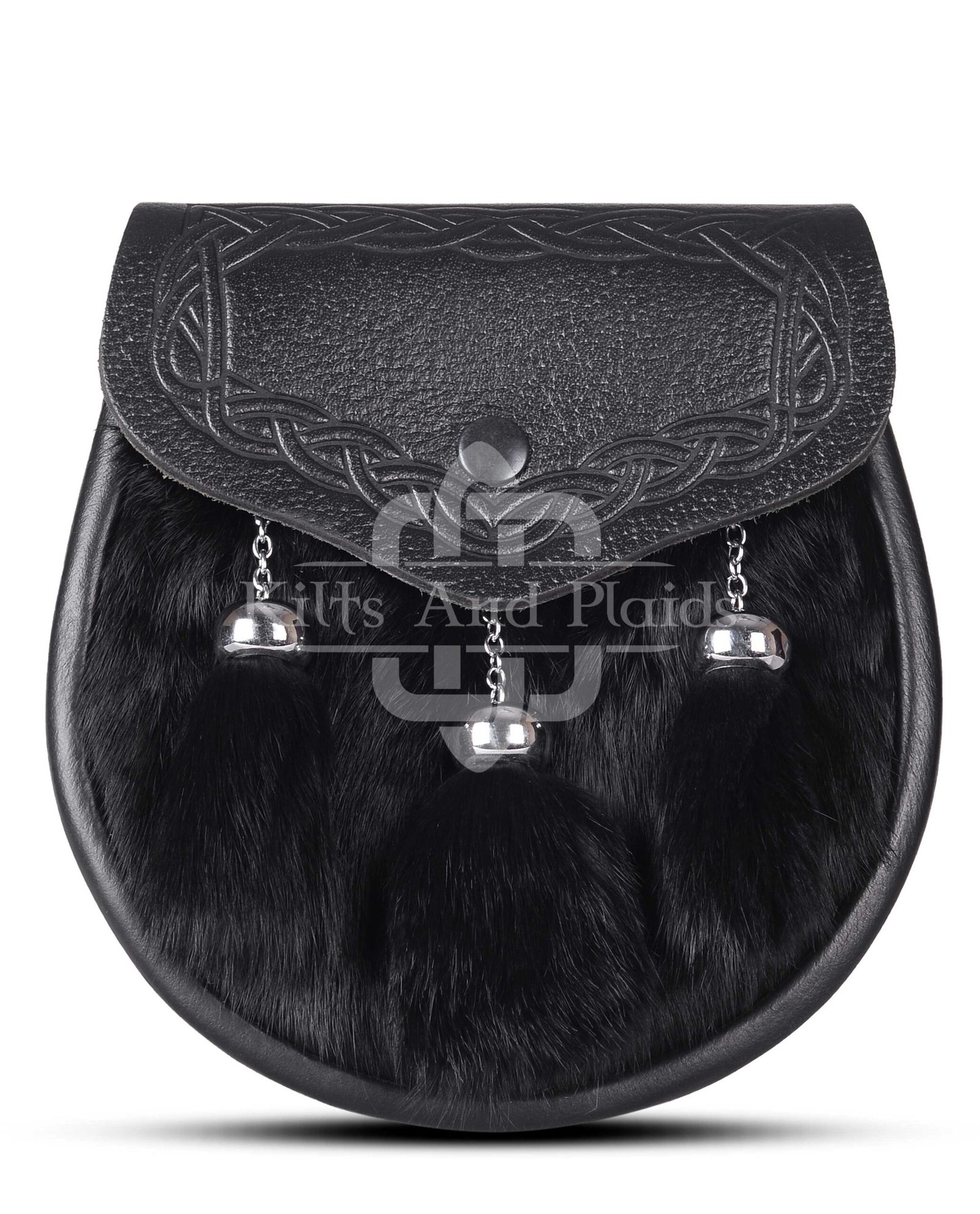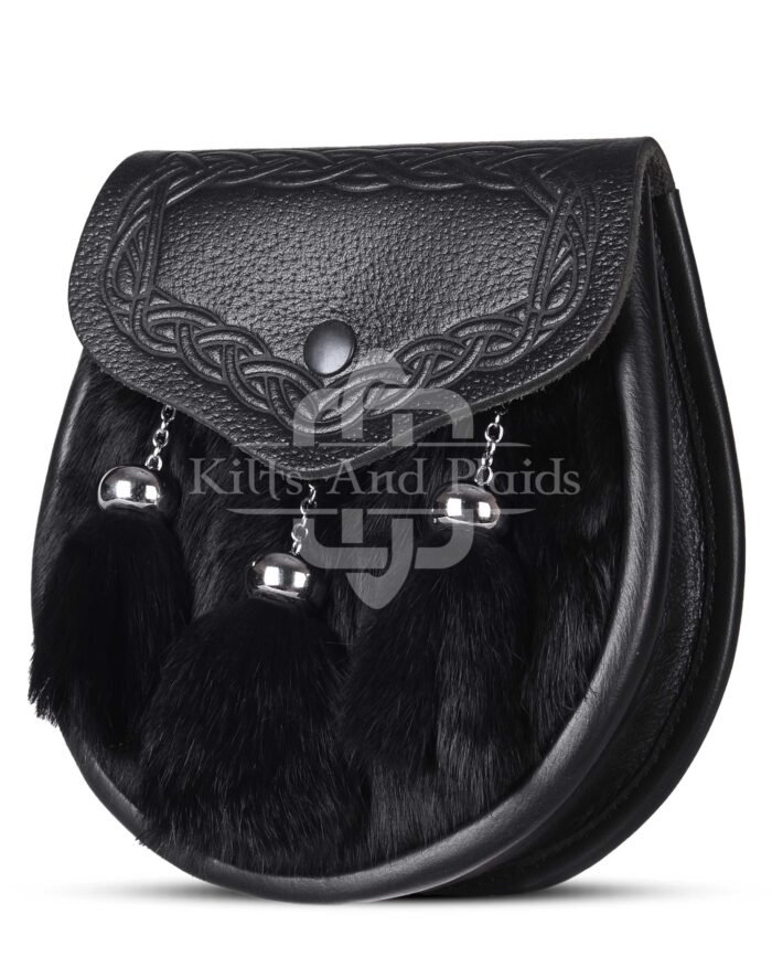 Expertly handcrafted from premium black leather, this semi-dress sporran features a luxurious panel of genuine black rabbit fur, offering a rich texture and a striking monochromatic look. The three matching tassels, suspended by braided leather cords, add subtle movement and authenticity to this timeless piece.