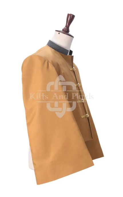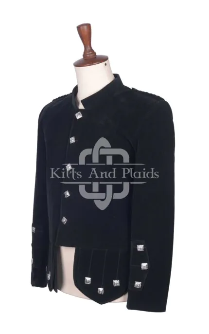 The jacket features non-functional decorative cuffs and dual side pockets, blending classic aesthetics with modern practicality. When worn with a matching leather or tartan kilt, it creates a striking ensemble that honors tradition without blending into the crowd.
