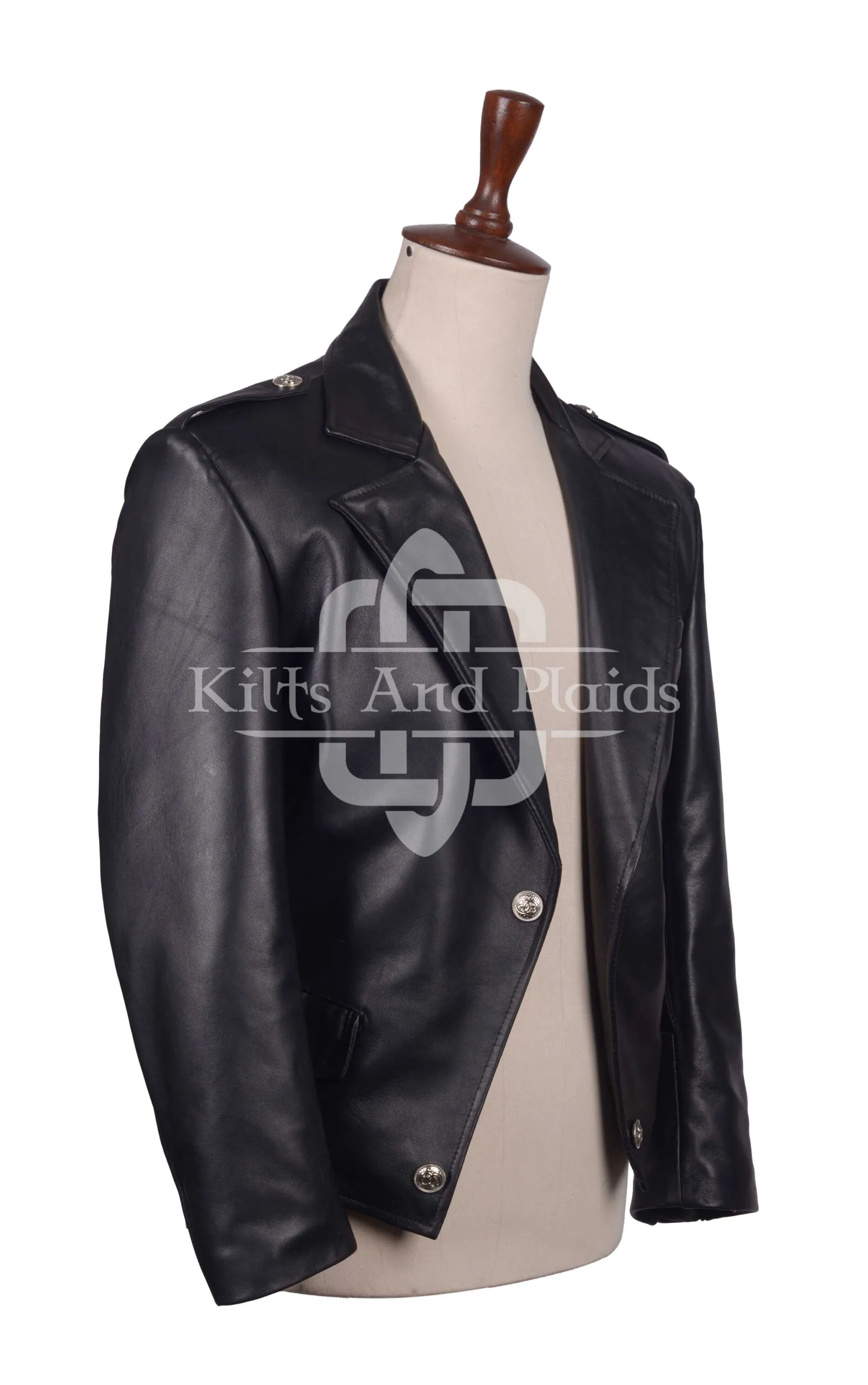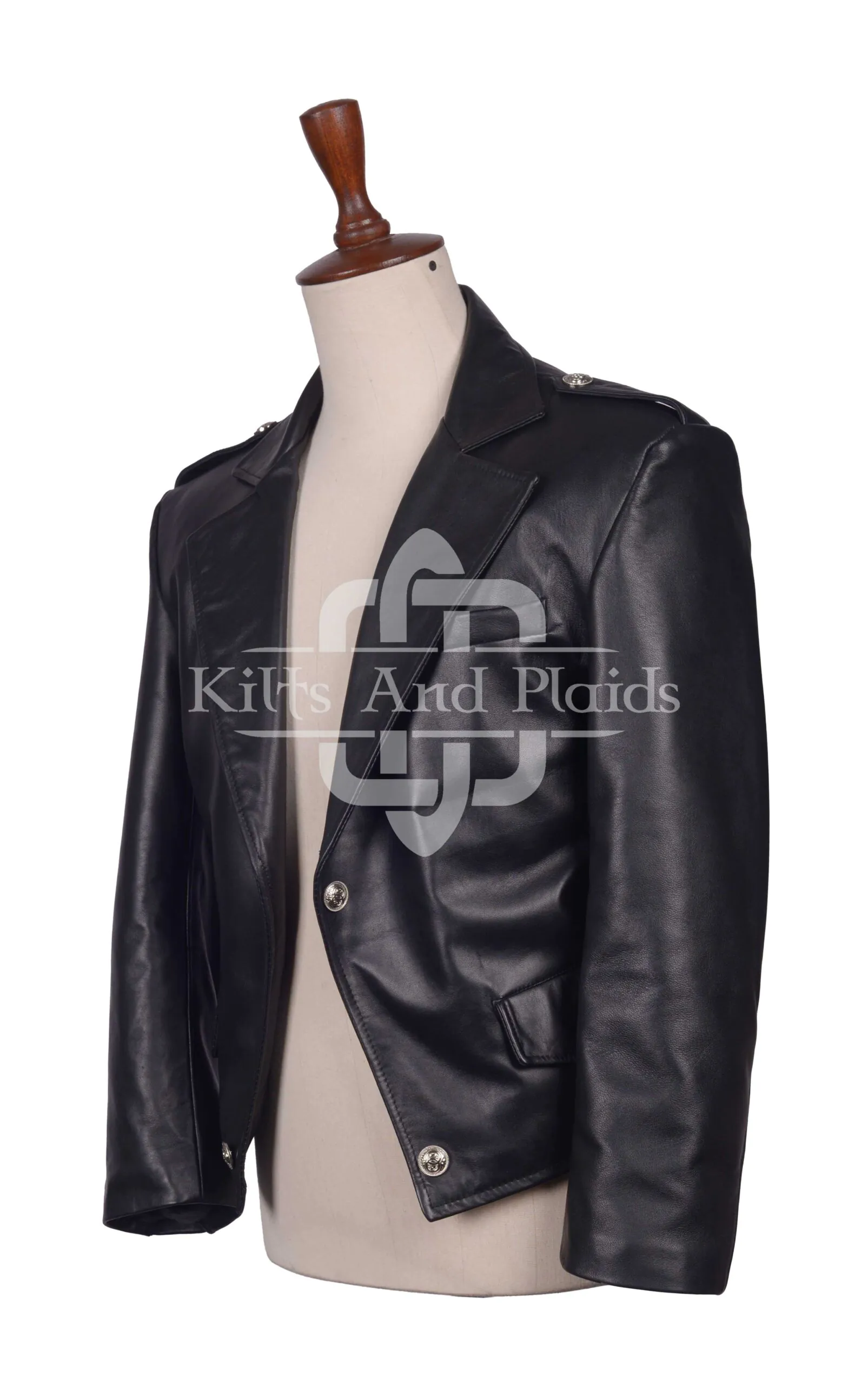 Whether you’re attending a black-tie event or a Highland-themed celebration, the Black Leather Prince Charlie Jacket gives you refined power with an edge.