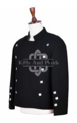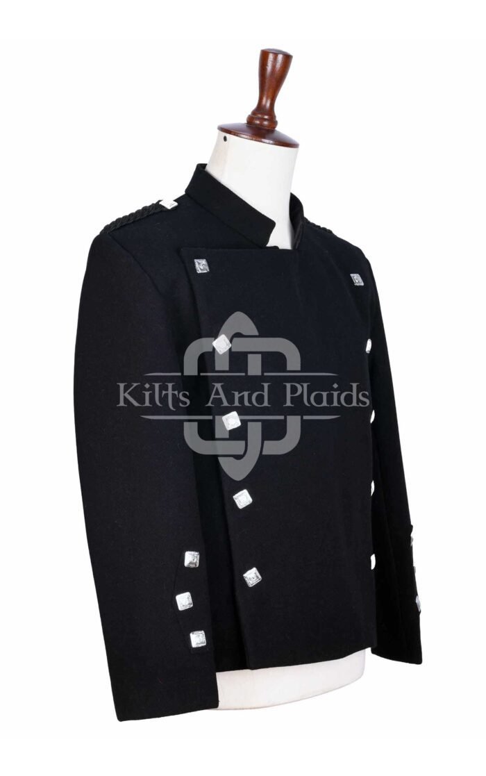 Silver-toned or nickel-plated buttons adorn the front, shoulders, and cuffs, adding both elegance and authenticity. Braided epaulettes on the shoulders enhance the ceremonial look, making this jacket perfect for pipe bands, Highland dress occasions, and historical reenactments.