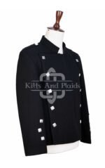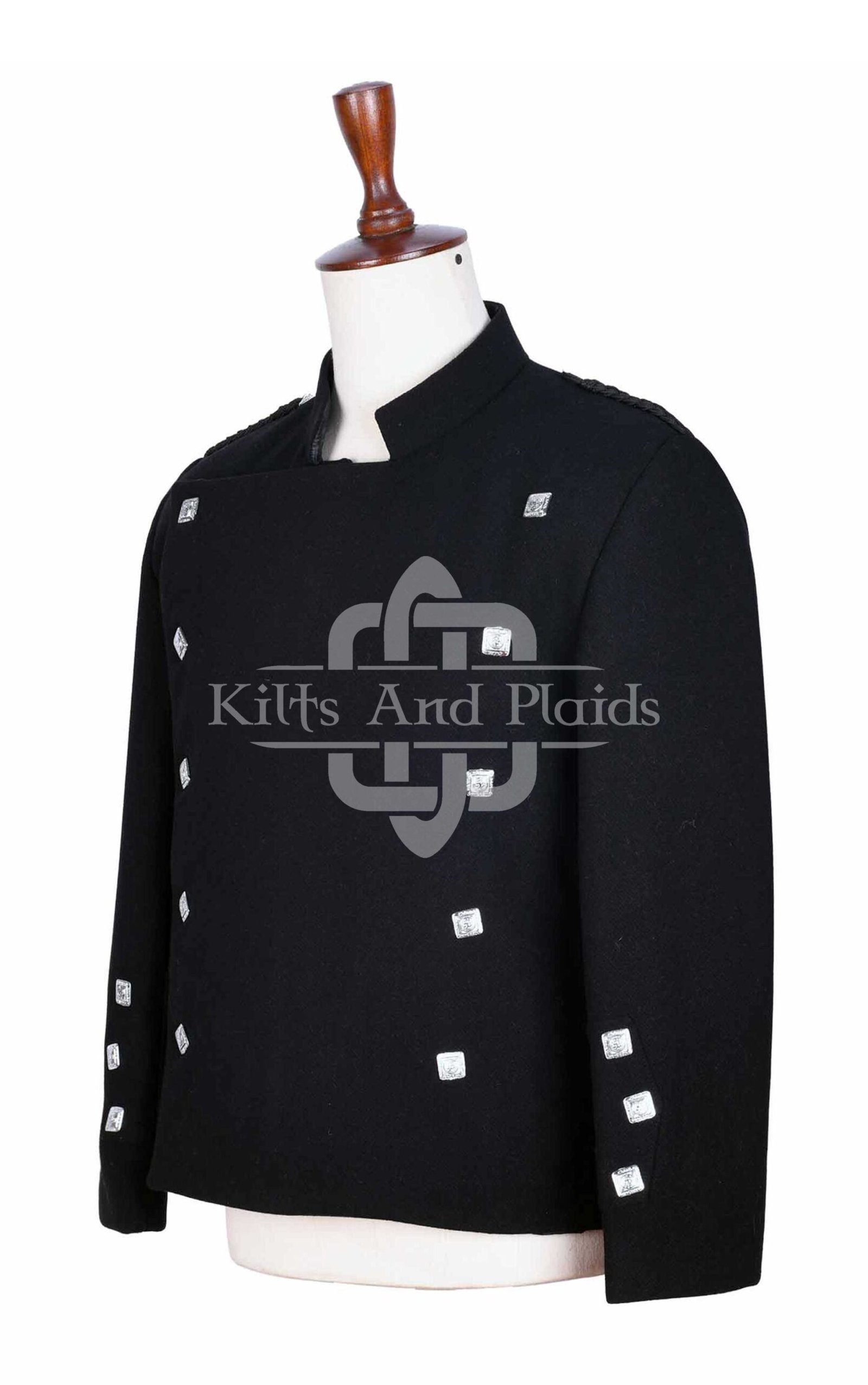 Scottish Black Melton Wool Silver Braided Military Piper Doublet