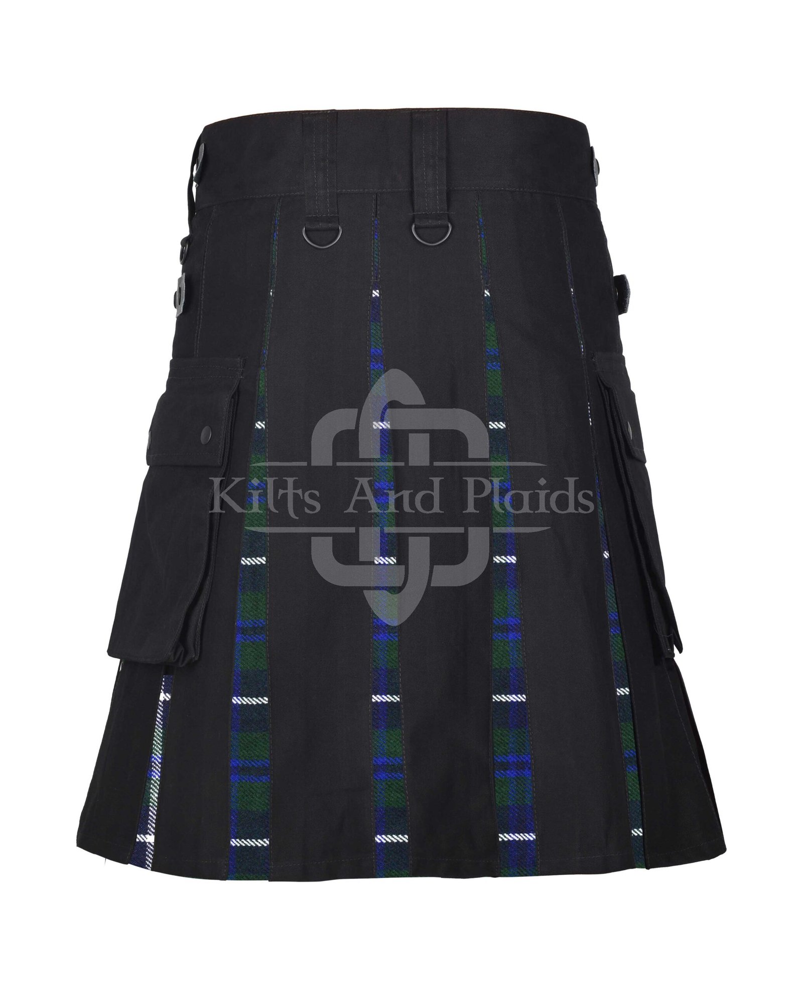 Built from 100% durable cotton, this hybrid kilt keeps you cool and comfortable through all-day wear. The design features a solid black front apron for a sleek, rugged appearance, while the Blue Douglas tartan pleats at the sides and back provide a nod to proud Highland tradition with their elegant mix of blues, greens, and muted tones.