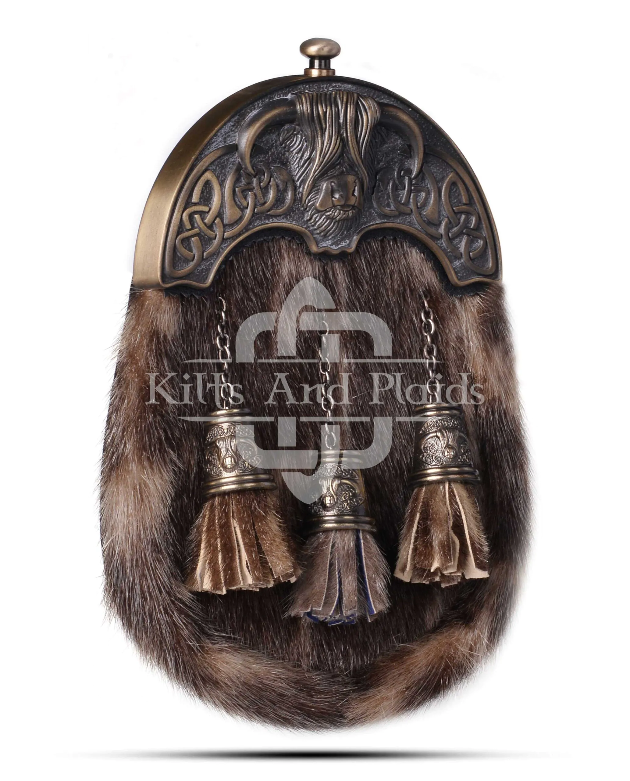 Three seal fur tassels hang from braided leather cords, preserving traditional styling while adding movement and richness to the design. The sporran opens with a snap closure, offering a roomy and secure compartment for everyday essentials like your phone, wallet, or keys.