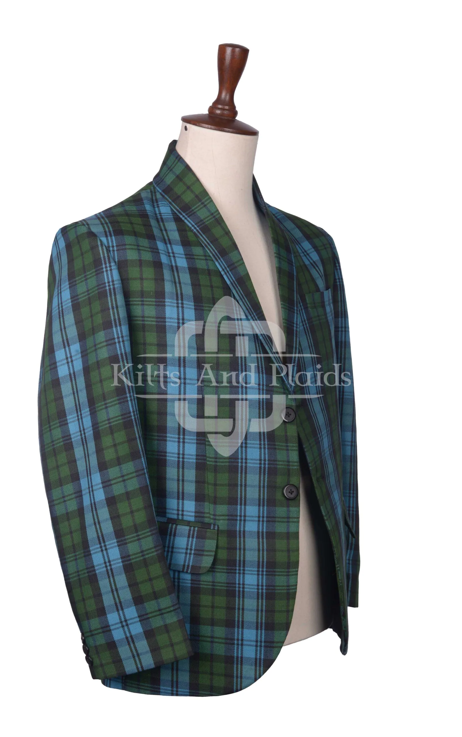 We use premium Campbell Ancient tartan wool, featuring soft tones of blue, green, and black. The fabric offers warmth, structure, and a classic pattern that honors centuries of Highland legacy. Our tailors shape the blazer with a modern yet timeless fit, complete with notched lapels and a two-button front.