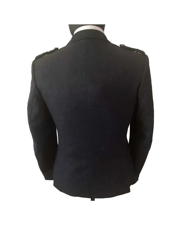 The jacket features traditional Argyll styling, complete with braided epaulettes, gauntlet cuffs, and decorative silver buttons. Its classic design offers a refined yet versatile alternative to the Prince Charlie jacket, making it suitable for both day and evening wear.