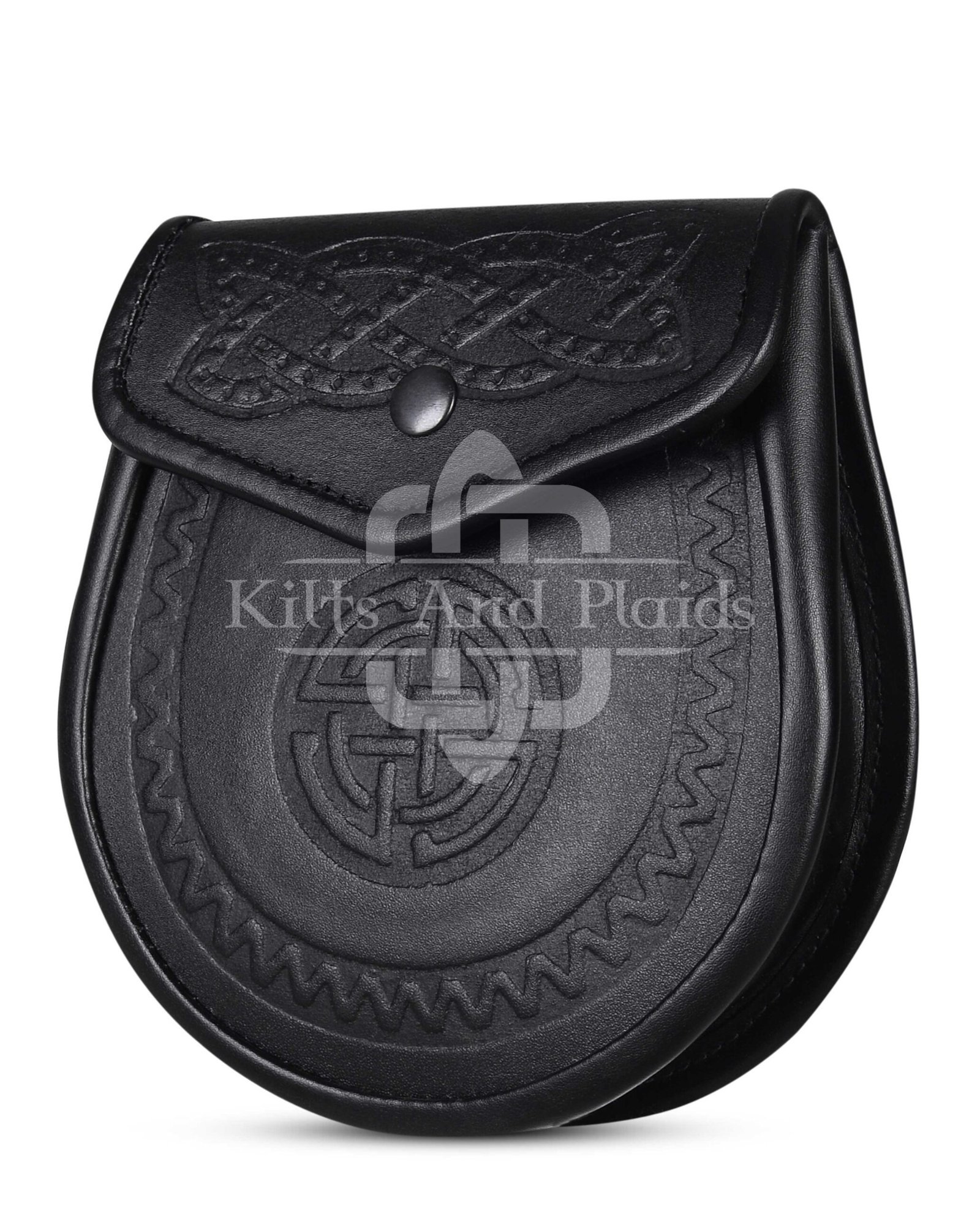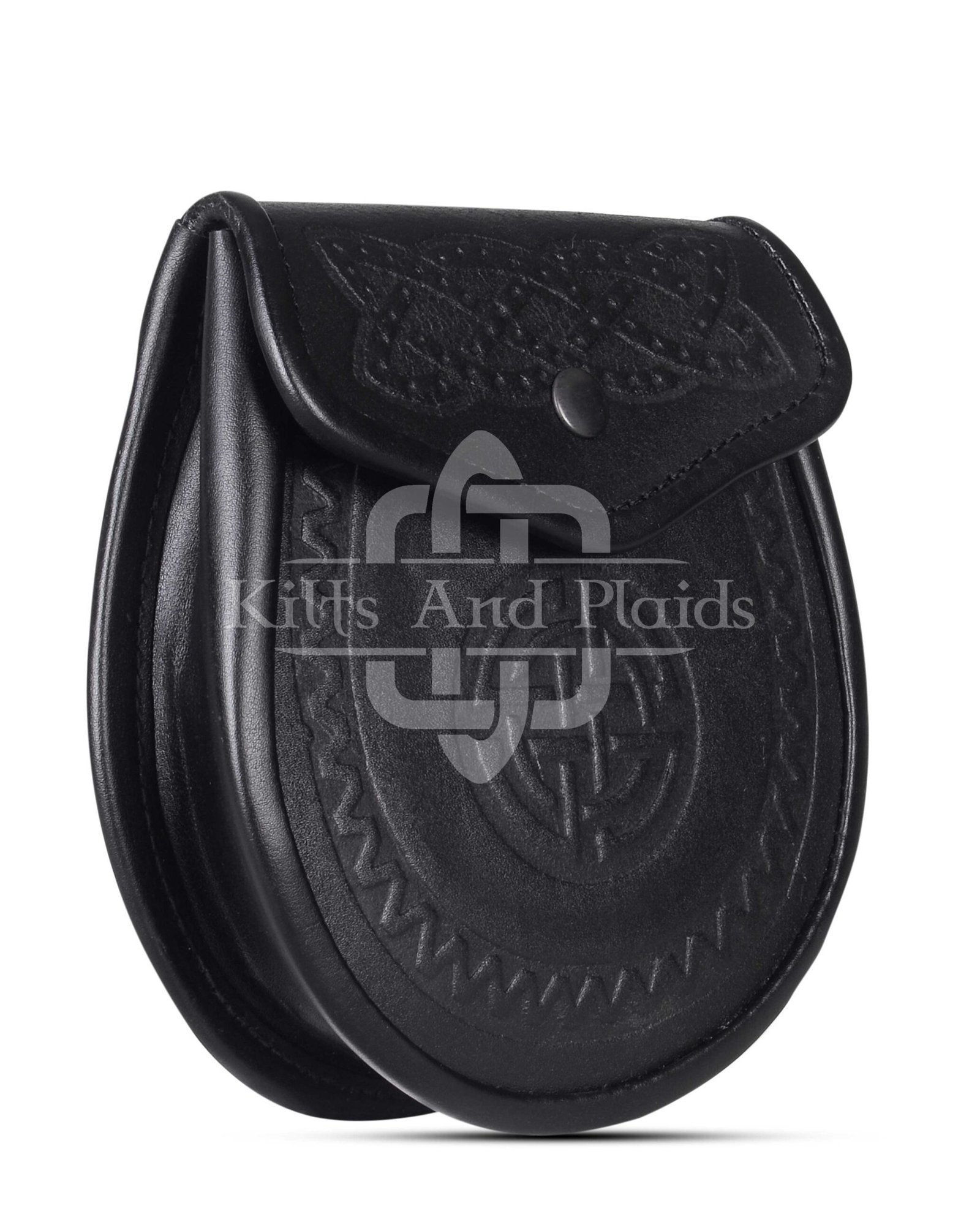 The double embossing gives the sporran a distinctive appearance, with intricate patterns that stand out against the sleek black leather. This adds a touch of elegance and refinement to your look, making it a versatile accessory that pairs well with a variety of tartans and kilts. The black leather not only provides a timeless aesthetic but also ensures durability, so you can count on this sporran for years to come.