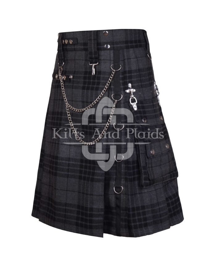 Unleash your bold style with the Gray Watch Gothic Kilt with Chains, a modern twist on traditional Highland wear. Designed for those who dare to stand out, this kilt blends classic Scottish elements with edgy gothic aesthetics. The subtle gray and black tartan exudes a sleek, urban vibe, while the heavy-duty metal chains and D-rings give it a powerful, rebellious look.