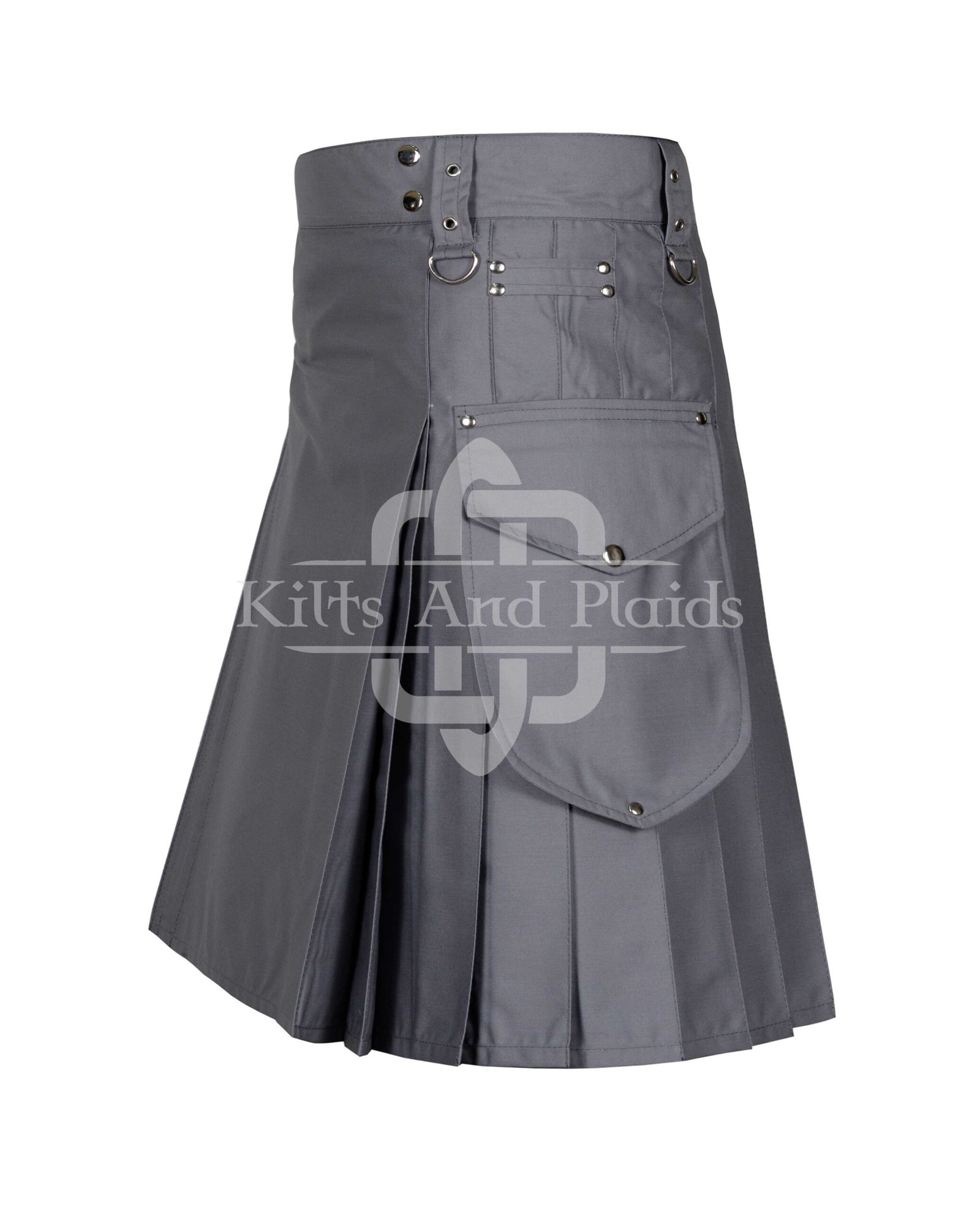 Crafted from high-quality 100% cotton canvas, the kilt offers exceptional strength while remaining breathable and comfortable for all-day wear. The versatile grey tone gives it a sleek, urban edge that pairs effortlessly with boots, utility vests, or casual shirts. A flat front apron keeps the look sharp and structured, while the pleated back allows full kilt swing and unrestricted movement.