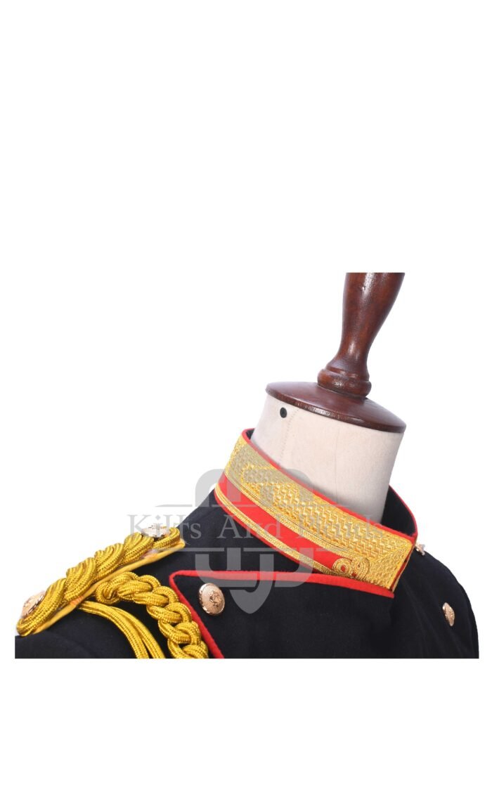 Crafted from high-quality wool or wool-blend fabric (customizable), the jacket features a structured silhouette, symbolic of command and authority. The dark navy or deep olive color reflects traditional military tones, while the stand-up collar and front button closure add a formal, polished look. Gold or silver buttons with engraved emblems offer a nod to authentic military regalia, enhancing its ceremonial appeal.
