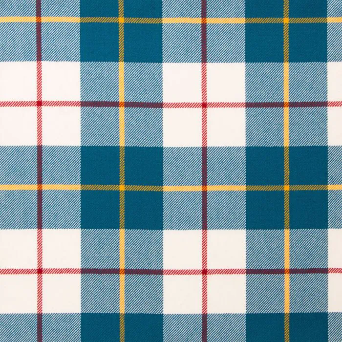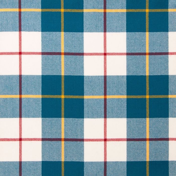 MacRae Of Conchrra Modern Lightweight Tartan is a white and blue-based fabric with a yellow check.Woven using 100% Pure New Wool this tartan is available for made to measure products, accessories, soft furnishings and craft projects. Made here in our mill in Selkirk, Scotland.