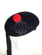 Its traditional rounded shape fits snugly and comfortably on your head. The smooth navy wool exterior gives the cap a sharp, understated appearance, making it a versatile piece for both formal and casual wear. A black pom-pom (toorie) sits on top, while black ribbon tails extend from the back, completing the authentic Highland look. The soft inner lining ensures comfort during long periods of wear, and the cap’s lightweight construction makes it easy to fold flat for storage or travel.