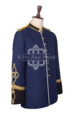 We craft this jacket using high-quality navy wool, offering warmth, durability, and a striking visual appeal. The tailored cut shapes a sharp silhouette, while the high stand collar and structured shoulders reinforce its commanding presence. Ornate brass buttons line the front and cuffs, reflecting historical detail, and subtle trims add depth and contrast to the overall design.