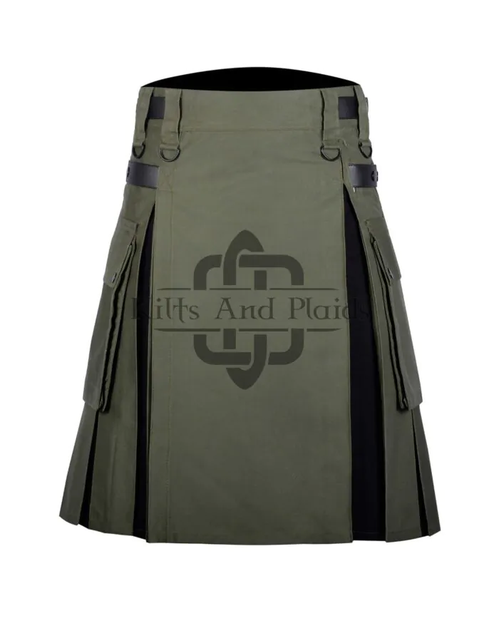 Crafted from durable olive green cotton, the front panel offers a clean, structured look, while the back pleats feature a striking black tartan that adds a subtle nod to Scottish heritage. This dynamic contrast creates a unique and versatile piece that transitions effortlessly from festivals to casual outings to tactical wear.