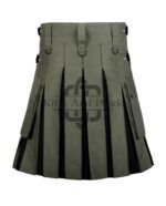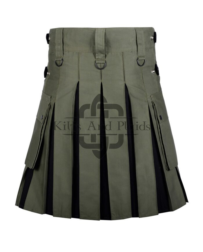 Crafted from premium olive green cotton, this kilt is built to last. Its breathable and durable fabric ensures all-day comfort in any environment—ideal for festivals, outdoor activities, or casual wear. At the back, deep pleats feature a striking black tartan that adds a timeless touch of Scottish tradition to the modern military-inspired style.