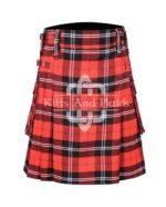 Designed for functionality, the Ramsay Red Tartan Utility Kilt includes adjustable leather straps with rust-proof metal buckles for a secure, custom fit. Spacious detachable cargo pockets on both sides provide practical storage for tools, gadgets, or personal essentials. Wide belt loops offer additional utility, allowing you to attach gear or accessories as needed.