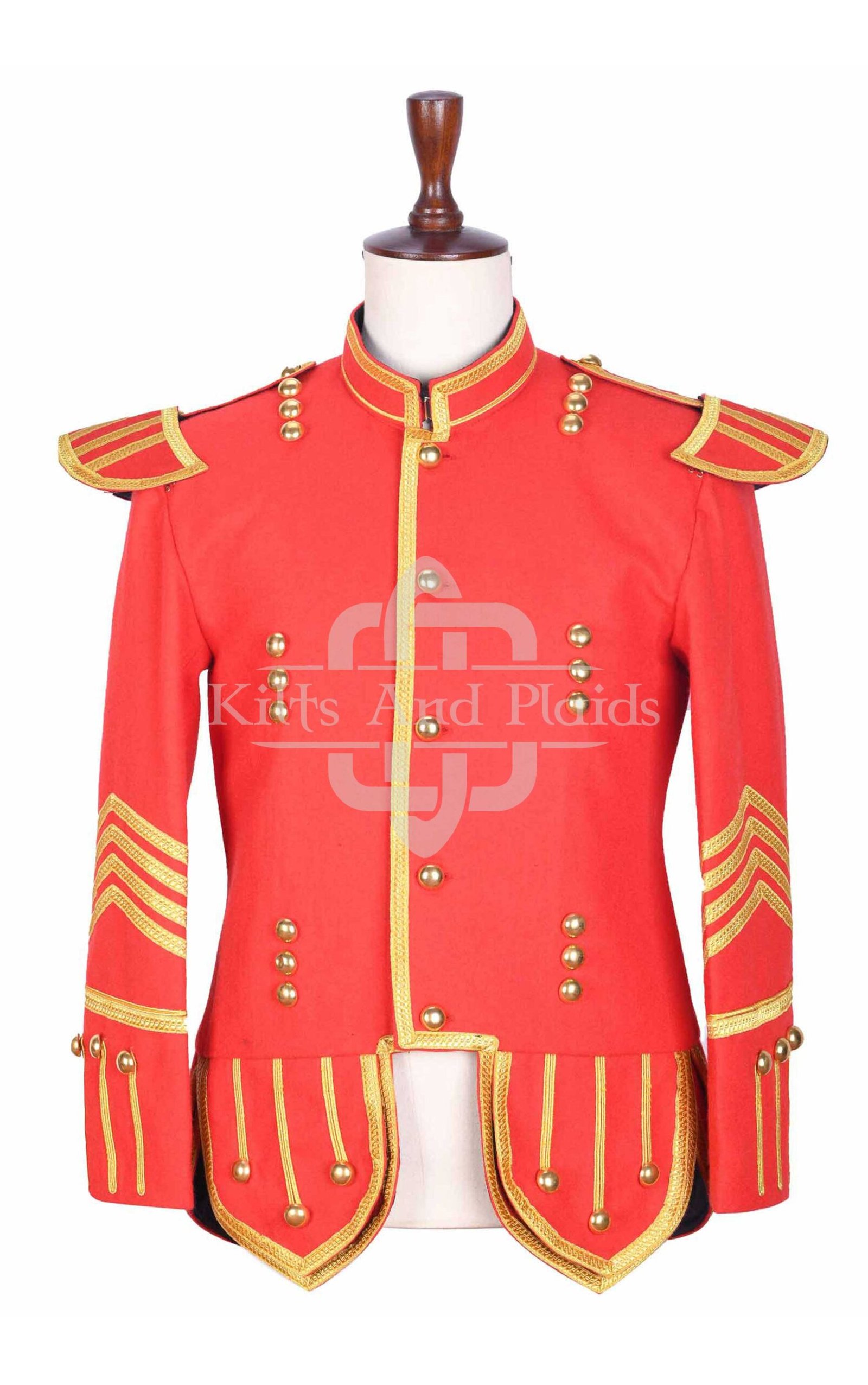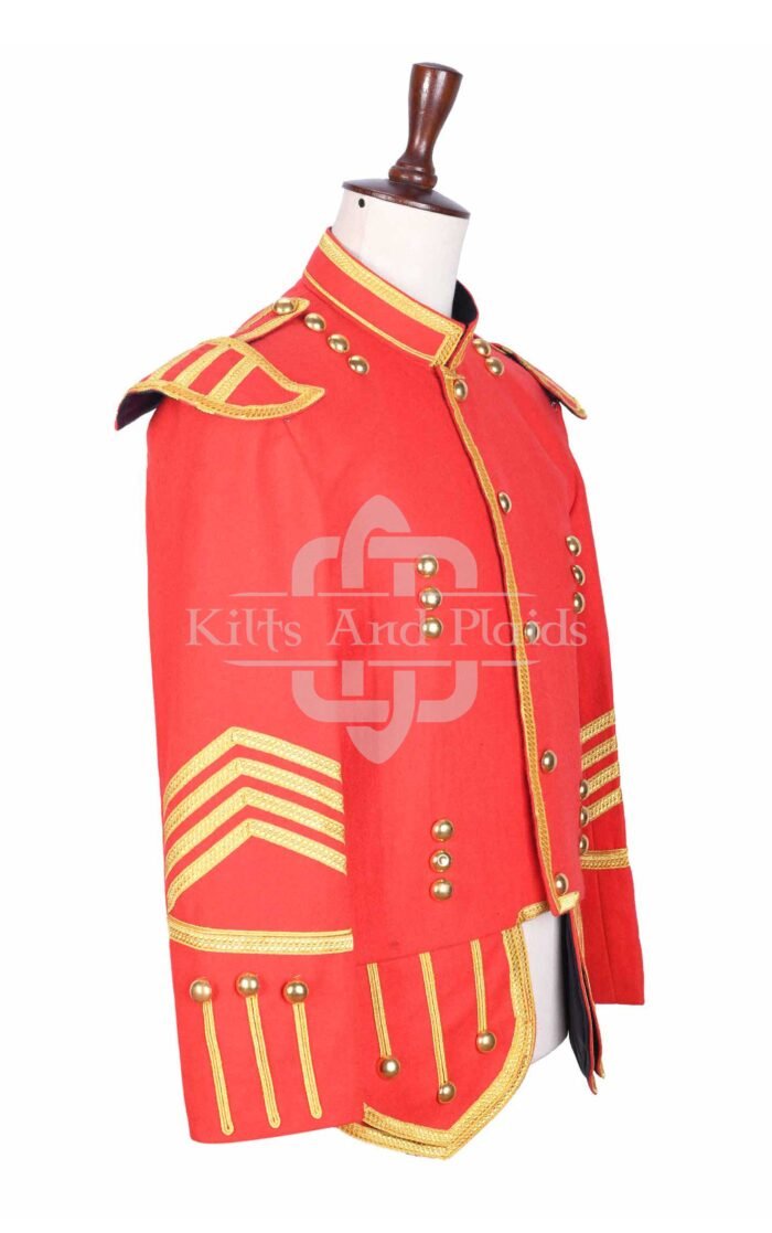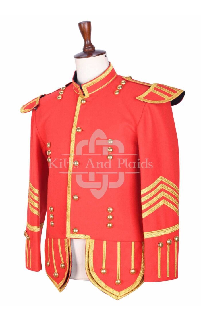 We design this jacket using premium red wool to provide both structure and warmth. Our expert tailors handcraft each piece with precision, ensuring a sharp fit and detailed finish. Rich gold braiding runs across the chest, cuffs, and epaulets, creating a striking contrast against the vibrant red base. Polished gold buttons line the front and sleeves, adding ceremonial character and authenticity.