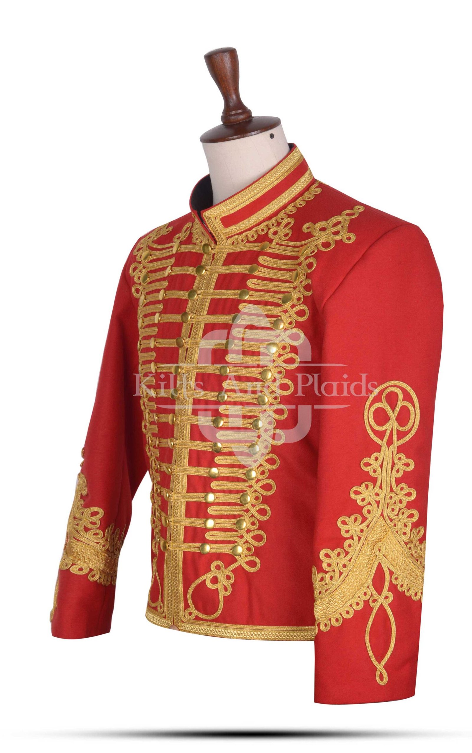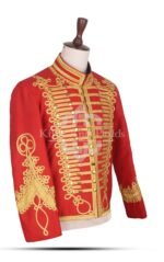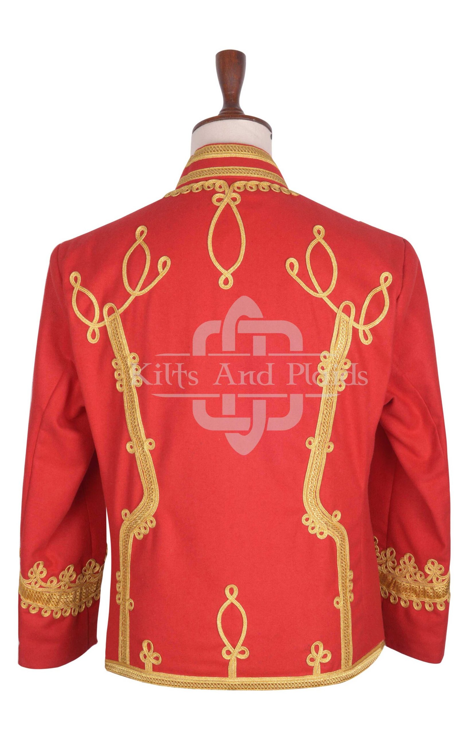 We craft this jacket using heavyweight red Melton wool for a structured, luxurious feel. Our artisans hand-apply intricate gold braiding across the front, cuffs, and shoulders to reflect traditional military regalia. Ornate metallic buttons add shine and complete the jacket’s regal aesthetic.
