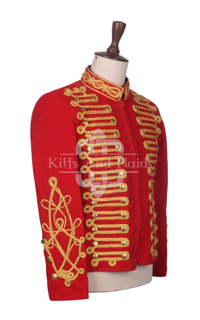 We tailor this jacket from premium red wool, chosen for its warmth, structure, and rich texture. Intricate gold braiding runs across the chest, shoulders, and cuffs, echoing the ornate detailing found in 18th–19th century officer attire. Decorative metal buttons add a final touch of ceremonial flair, enhancing the jacket’s regal appeal.