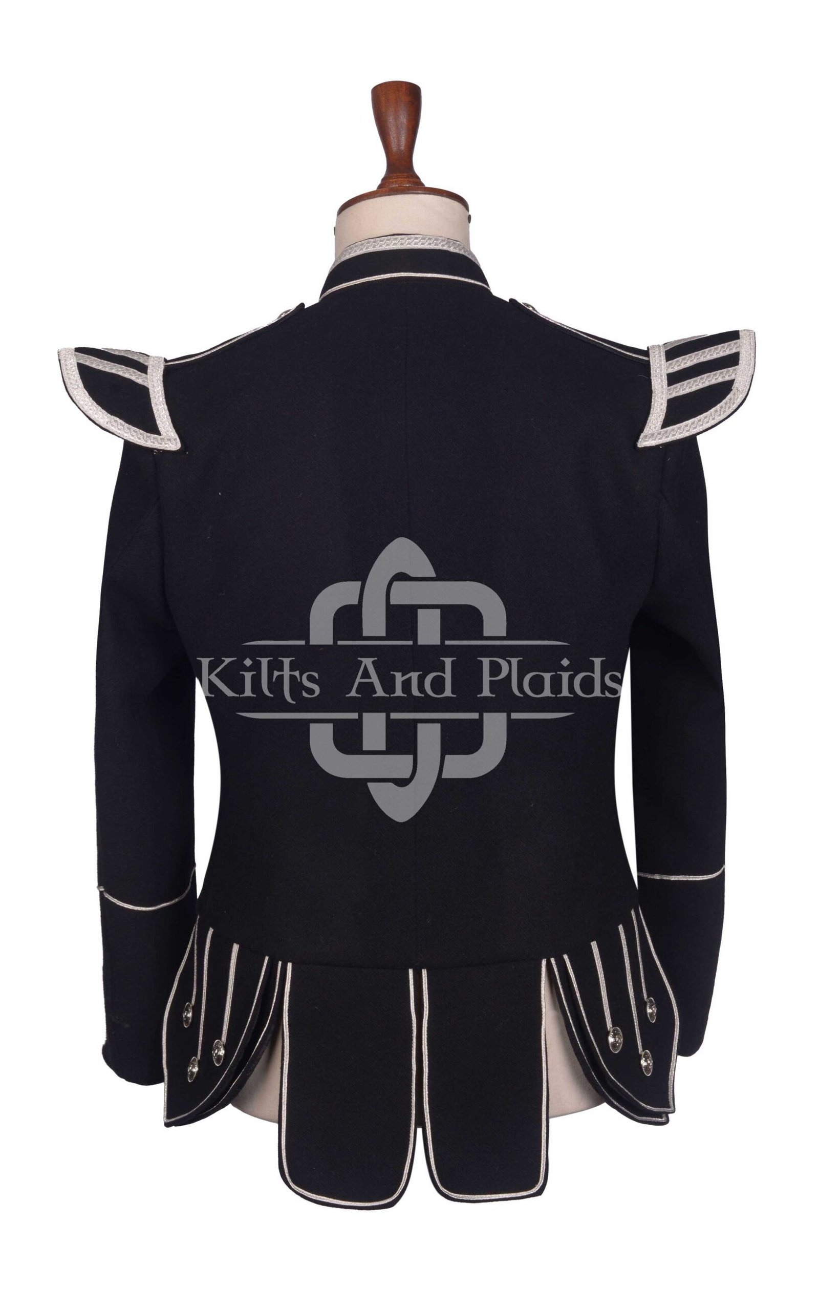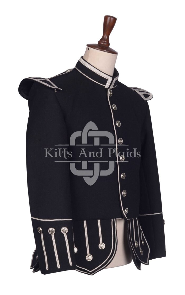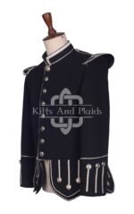 Scottish Black Melton Wool Silver Braided Military Piper Doublet