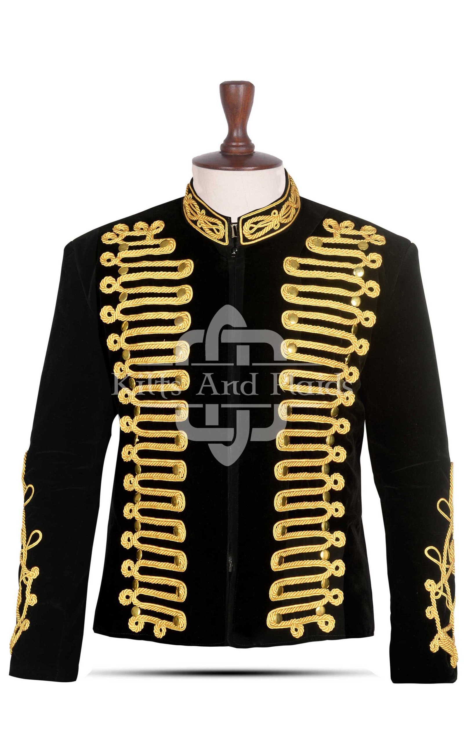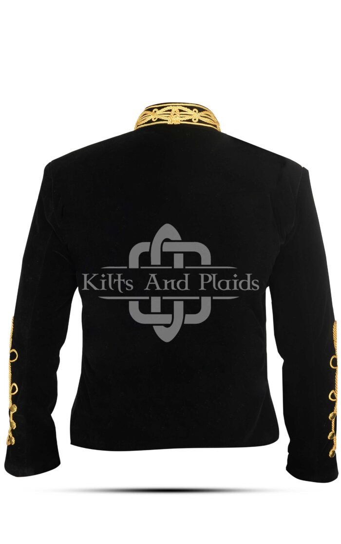 Polished gold buttons, embossed with traditional Scottish motifs, add further authenticity and brilliance. The jacket is fully lined for comfort and durability, with internal pockets for modern practicality. Whether you’re leading a band, attending a Highland ceremony, or making a bold fashion statement, this doublet-style Scottish Black Velvet Gold Braided Military Hussar Jacket sets you apart.