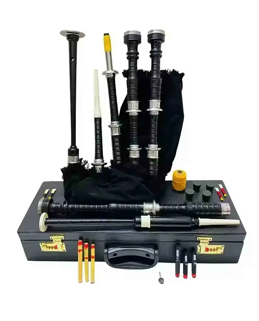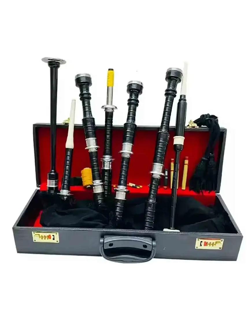 Built for learners and seasoned pipers alike, the Scottish Highland Silver Mounts Rosewood Black Bagpipes combine traditional craftsmanship, durability, and symbolic Scottish pride in one complete set.
