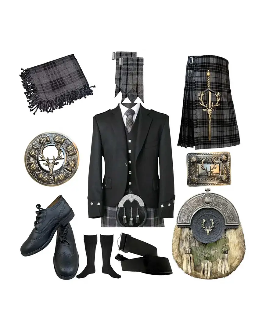 The highlight of this set lies in its stag head–themed accessories, including a sporran, kilt pin, and belt buckle, all designed with the proud stag motif—a symbol of strength and heritage. Completing the look, the outfit also includes flashes, kilt hose, and ghillie brogues, ensuring an authentic Highland appearance from head to toe.