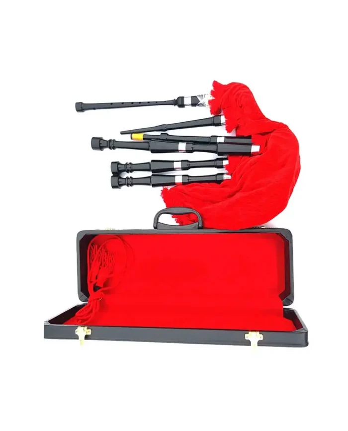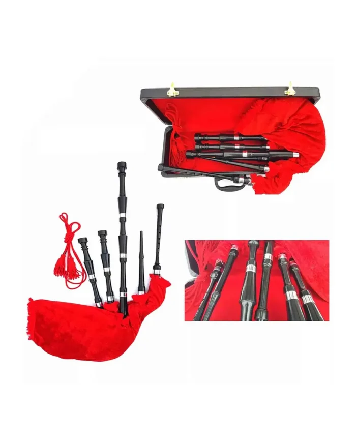 The bagpipe features a striking half red tartan cover with matching cords, creating a bold visual appeal. Equipped with a synthetic bag for reliable airflow, a precision chanter, and resonant drones, it produces the deep, rich tones that make Highland music unforgettable. A protective carry case ensures safe transport, making it an excellent choice for practice, performance, or ceremonial occasions.
