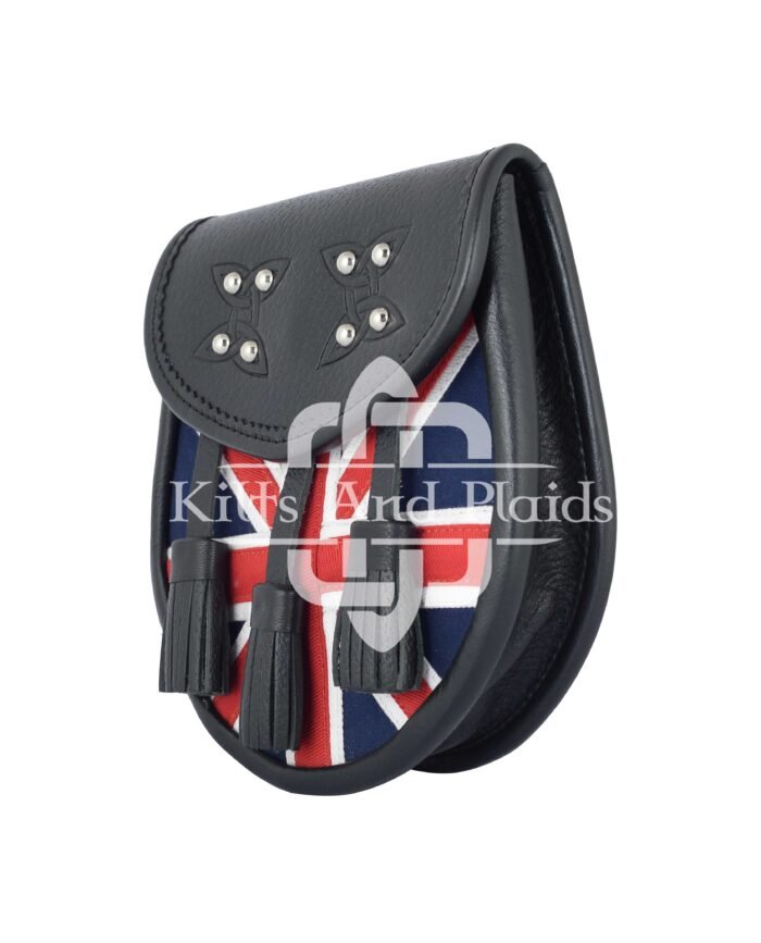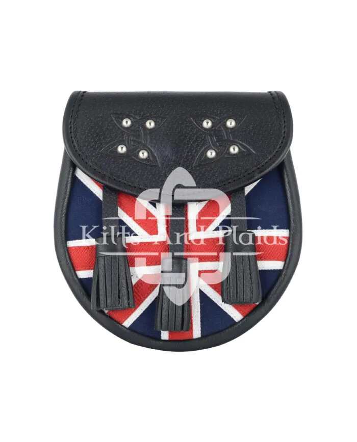 Showcase style and heritage with the Scottish Semi Dress Leather UK Flag Sporran, crafted from premium leather for durability and a polished look. Featuring the iconic UK flag design, this semi-dress sporran adds a bold, patriotic touch to any kilt ensemble while maintaining traditional Highland elegance.