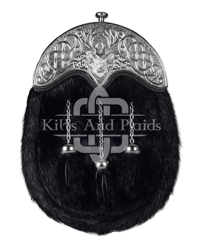It includes an adjustable chain strap. The strap wraps comfortably around your waist and fits securely with any kilt.Silver Stag Head Black Seal Fur Full Dress Sporran