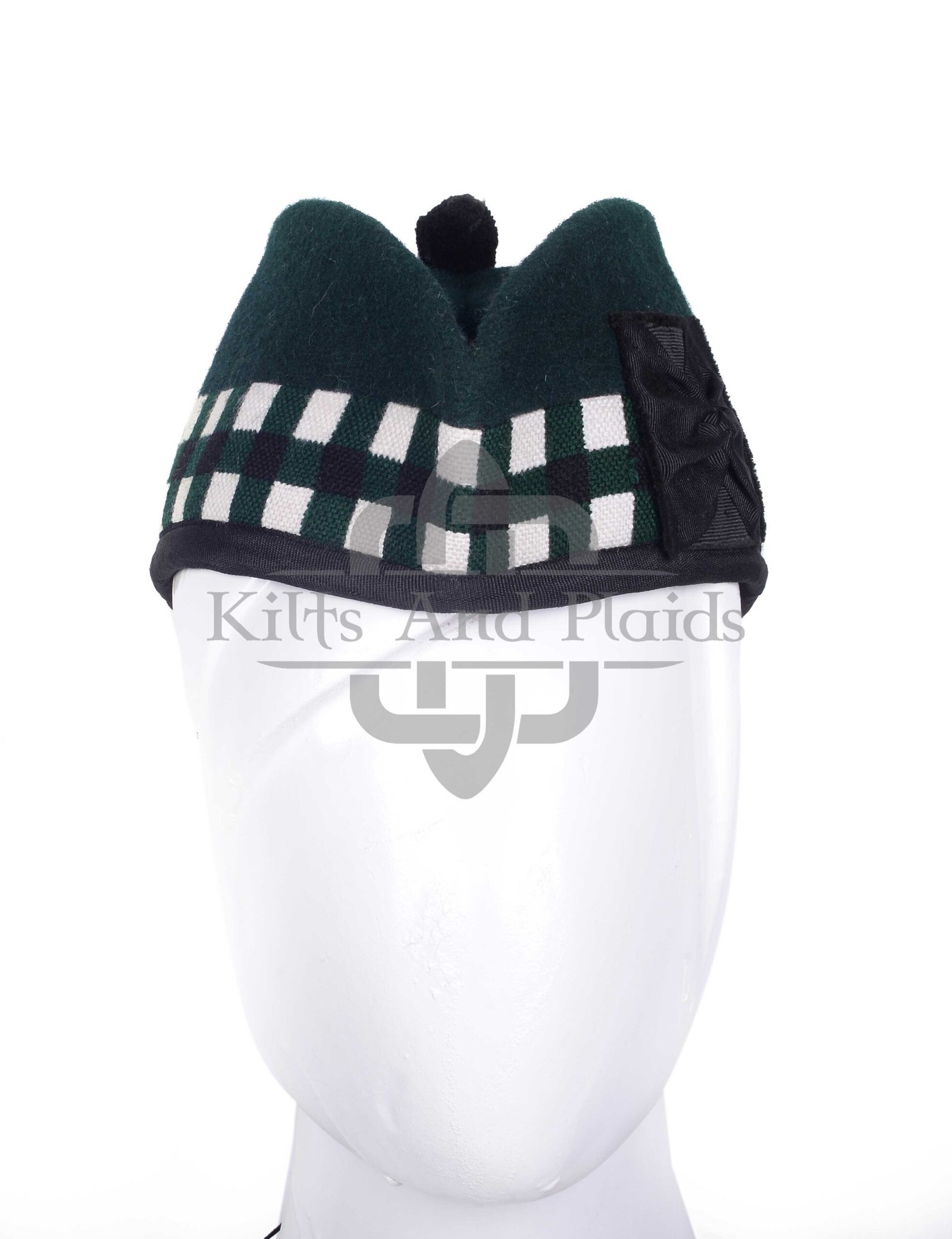 The cap’s classic rounded shape sits comfortably on the head and is designed for all-day wear. A black pom-pom (toorie) sits at the crown, and long black ribbon tails flow from the back—finishing the cap with iconic Scottish flair. The solid green wool exterior makes this cap a bold alternative to more common colors, yet its simple, pattern-free design maintains the refined look of Highland tradition.