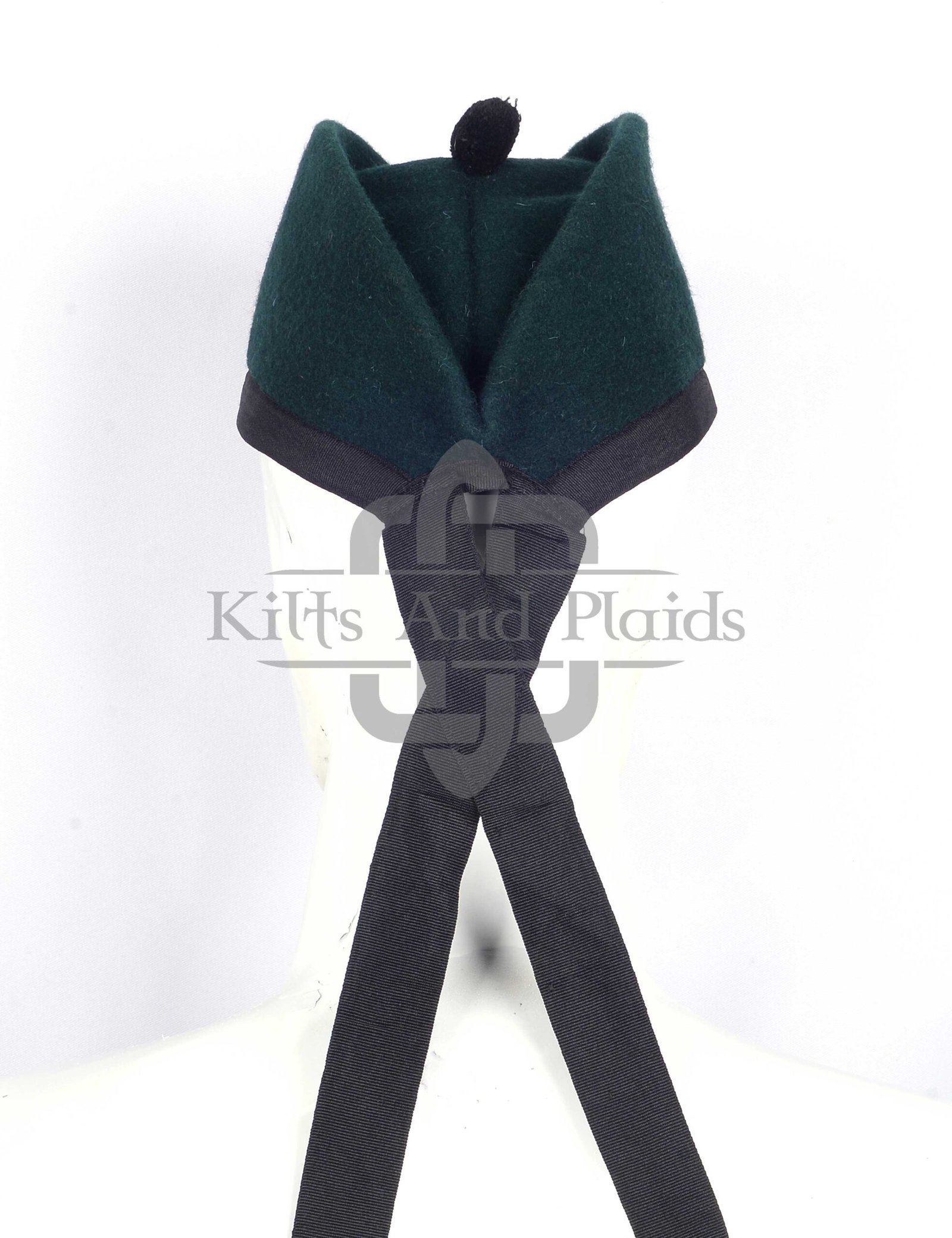 Its traditional rounded shape fits securely and comfortably on your head, making it ideal for long periods of wear. A black wool pom-pom (toorie) tops the cap, while black ribbon tails at the back complete the classic Highland look. With no diced pattern or embellishments, the solid green wool design keeps the cap clean and refined, allowing the bold color and structure to stand out.