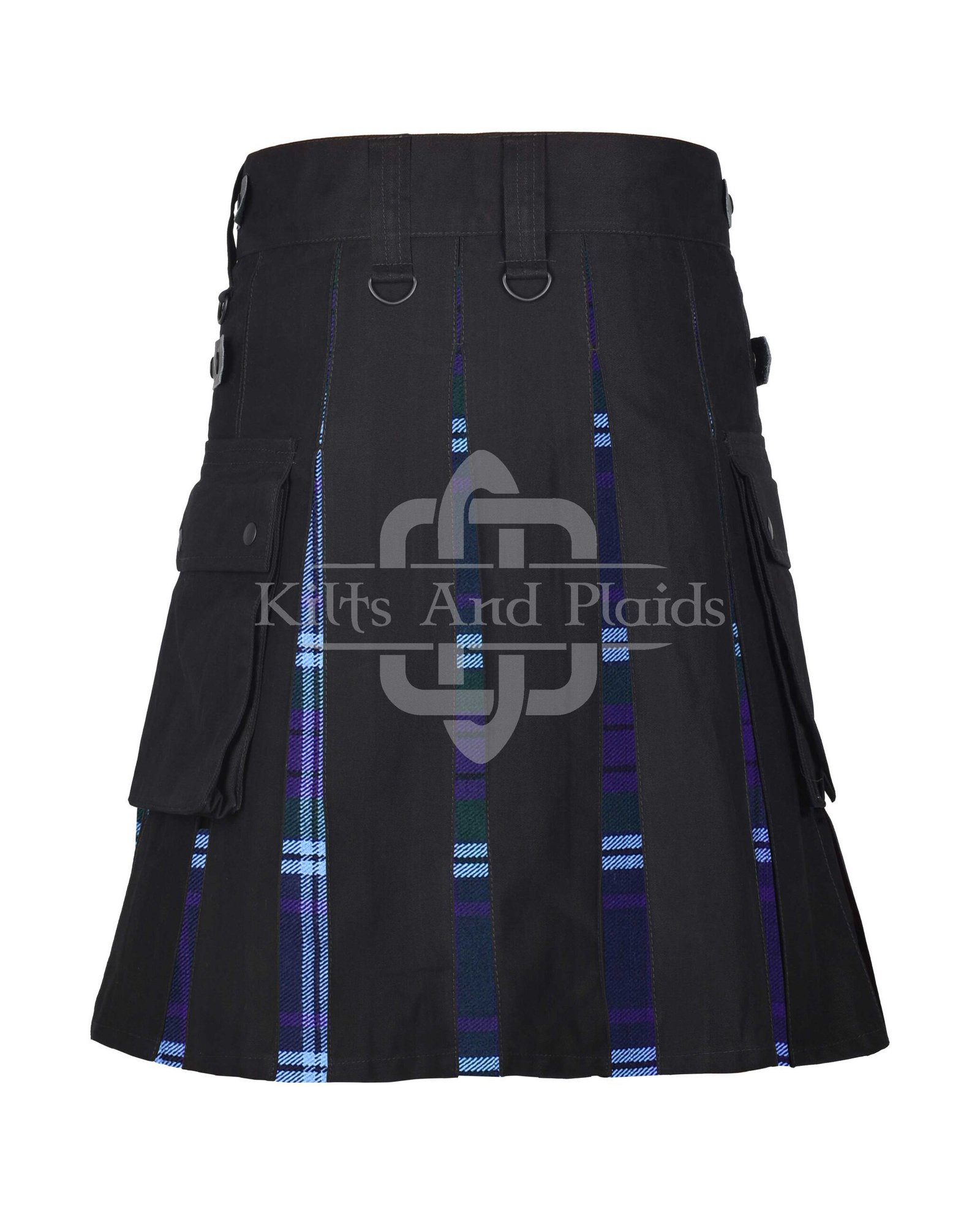 Made from 100% premium cotton, this hybrid utility kilt offers exceptional breathability and strength. It’s ideal for long wear and active use, delivering comfort without compromising style. The front features a solid black apron that gives a bold, streamlined look, while the pleated back and sides display the stunning Spirit of Scotland tartan — a vibrant blend of deep purples, blues, and greens, symbolizing unity and national pride.