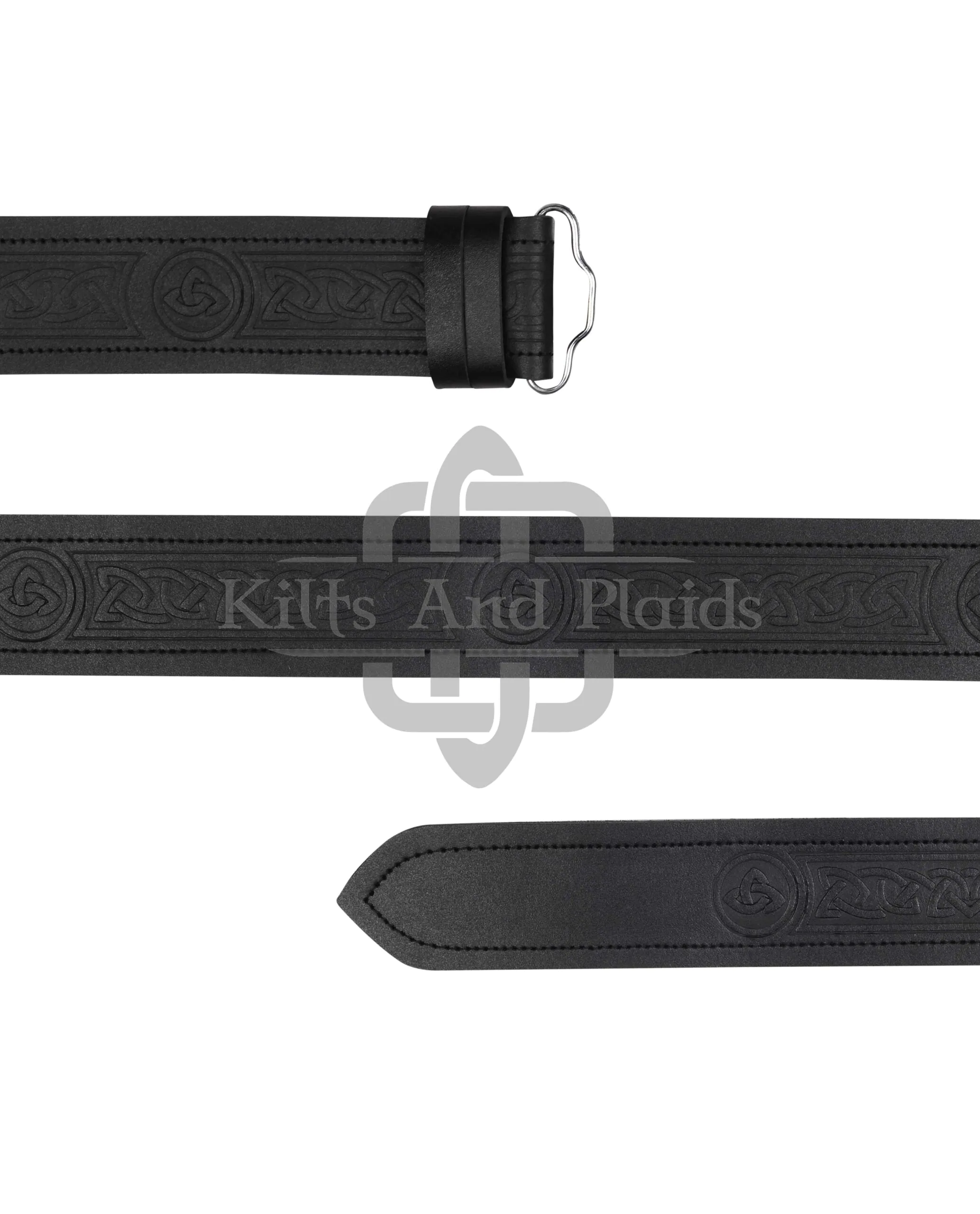 Celebrate your Celtic heritage with the Trinity Knots Embossed Leather Kilt Belt. Crafted from premium black leather, this belt features the iconic Trinity Knot design. A symbol of eternity, unity, and interconnectedness, the Trinity Knot is beautifully embossed along the length of the belt. The intricate design adds depth and texture, making the belt a standout piece in your Highland or formal outfit.