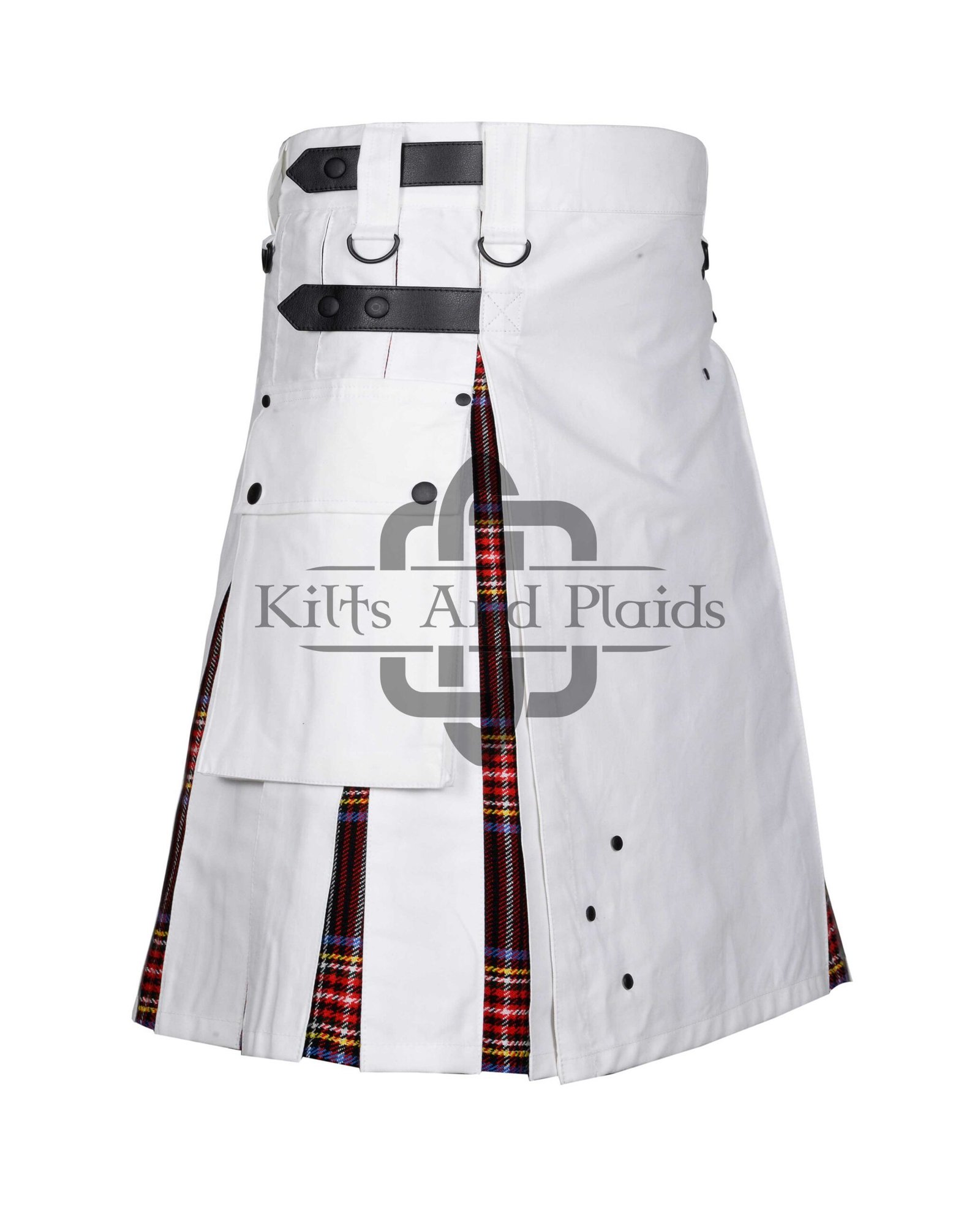 Tags: cotton & tartan kilt, Hybrid Kilt, Tartan Hybrid Kilt, White Cotton Stewart Black Tartan Hybrid Kilt