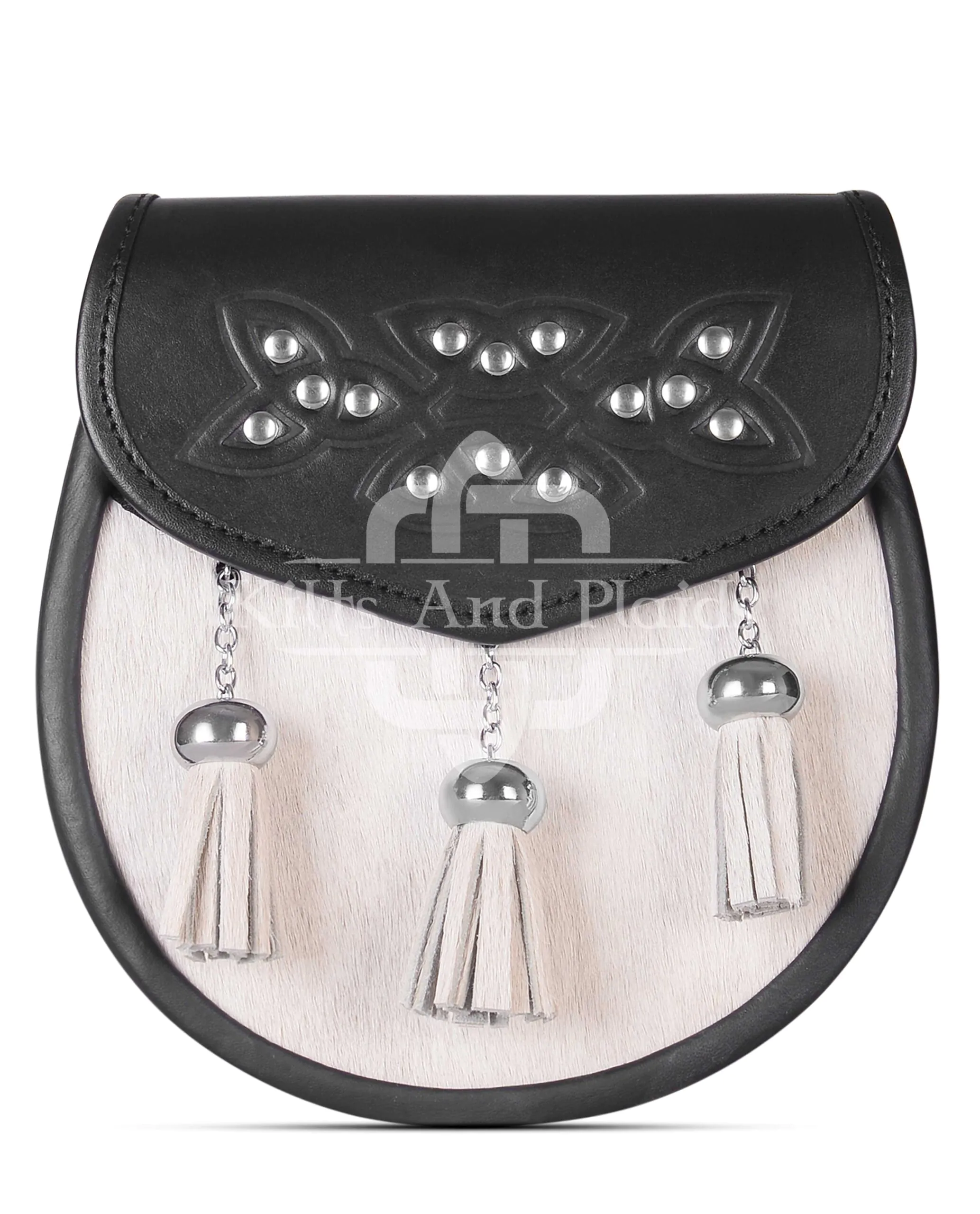 Thistle Emblem Black Leather White Bovine Fur Sporran